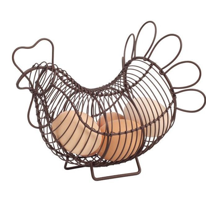 This cute chicken shape egg basket holds half a dozen eggs comfortably and will sit on the smallest of shelves